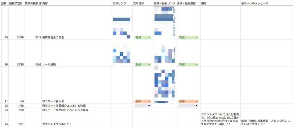こちらの画像は、Instagram投稿物の作成にあたり、進捗を把握するためのシートの一部です。綿密なスケジュールを組み、進捗管理を行った上で、分担して投稿内容を準備したことで、Instagramに毎週投稿するという目標を達成することができました。