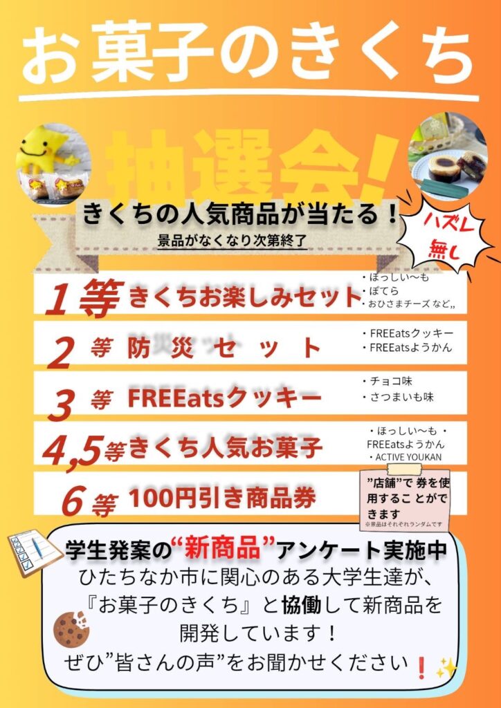 私たち【商品開発コース】は、地域のお菓子屋さんであるきくちと協力し、商品開発を目指して活動をしてきました。きくちはひたちなか市に本店を置く老舗のお菓子屋さんで、「ほっしぃ~も」など、ひたちなか市を代表するお菓子を製造・販売しています。