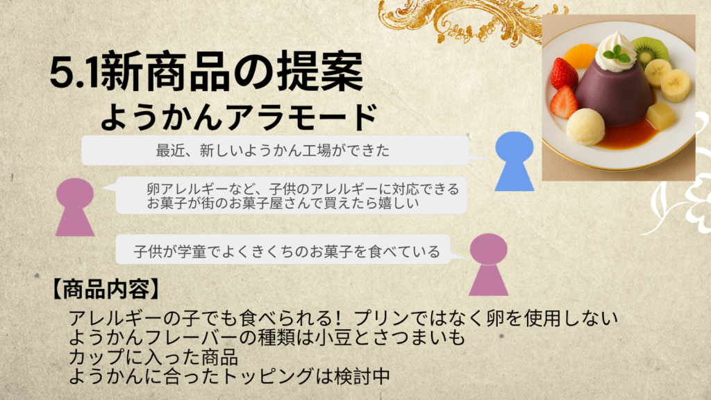合宿では様々な新商品のアイデアが出たのですが、そのうちの一つとして、「卵アレルギーの子でも食べられる華やかなお菓子として、ようかんをプリンアラモード風にした新商品はどうか」という意見が上がりました。
