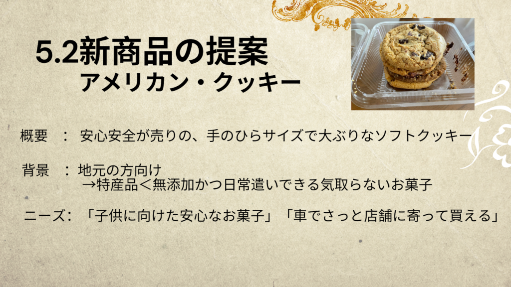 新商品案にブラッシュアップを重ねた甲斐あって、提案した8つのうち、「ようかんアラモード」と「アメリカンクッキー」を、試作していただけることになりました!