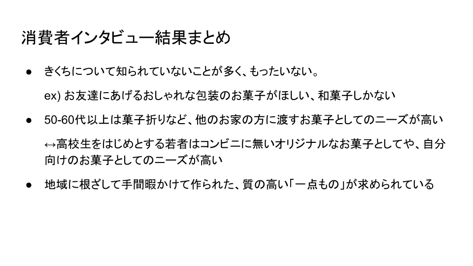ひたちなか市に本店があるにもかかわらず、きくちにほとんど行かないという市民の方が半数近くいらっしゃって、衝撃を受けた場面もありました。一方で、「地元のお店だから。」「老舗の美味しいお菓子屋さんのイメージがあるから。」と、きくちでお菓子を購入するという方も多かったです。地域の方々にとっても、きくちは知る人ぞ知る名店だったようです。