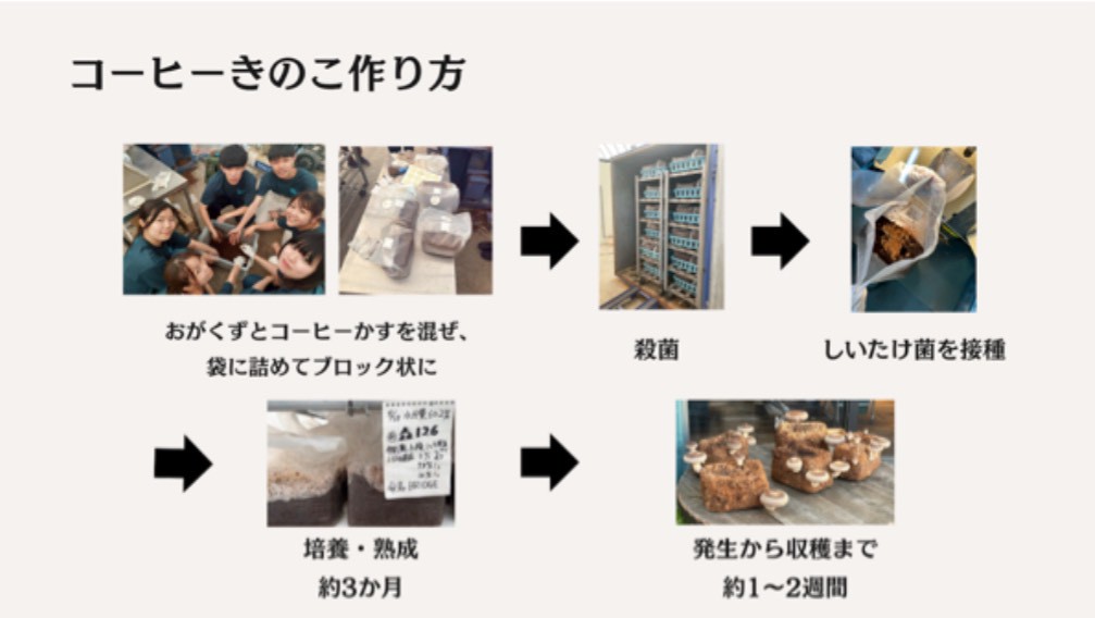 本取り組みは、地域に存在しながら十分に活用されてこなかった資源を新たな価値へと転換し、持続可能な形で地域に還元する仕組みを構築することを目指しています。地域との関わりに関心を持つ大学生を中心に、株式会社ビオクオンおよび、Bio QUONの運営としいたけ栽培を行うキノコノゴエンの協力のもと、コーヒーかすを培地として育てたきのこを活用した商品づくりや、関連イベントの企画・運営に取り組みます。