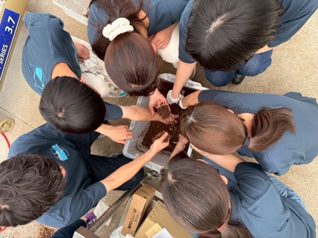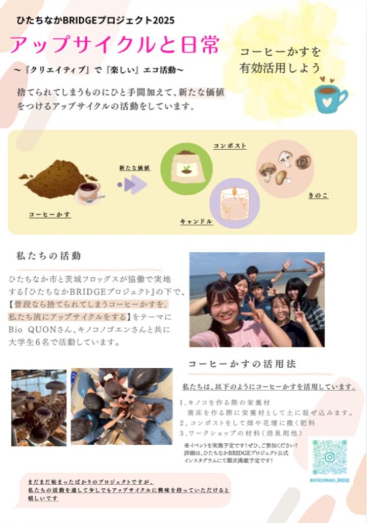 ひたちなかBRIDGEプロジェクト2025では、地域資源の循環をテーマに、オーガニックショップを運営するBio QUON(オーガニックカフェSHOP/Bio QUON/ひたちなか市(@bio_quon) • Instagram写真と動画)の協力のもと、活動を行いました。Bio QUONは、環境に配慮した商品や暮らしを提案し、地域内での資源循環や持続可能な取り組みを実践している企業です。本プロジェクトでは、共同して、地域のカフェなどから回収したコーヒーかすを活用し、これまで廃棄されがちであった資源を新たな価値へと転換するプロセスに取り組みました。また、私たち自身がアップサイクルへの理解を深めるため、Bio QUONの方々から実践に基づいたお話を伺う機会も設けていただきました。