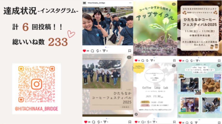 より多くの方々に活動内容を届けるため、Instagramでの投稿にも取り組みました。8月の合宿から12月の最終報告会までの期間に計6回投稿し、総いいね数は233に達しました(2026年1月5日現在)。投稿内容は、メンバー紹介をはじめ、アップサイクルを通じたコーヒーかすの活用方法、参加イベントの告知や実施報告など多岐にわたります。写真を多く用いるとともに、情報量や構成を工夫し、活動への興味や親近感を持ってもらえるよう意識しました。実際にチラシ配布の場でその場でInstagramを閲覧してくださる方もおり、私たちの取り組みや想いが伝わっていることを実感できました。