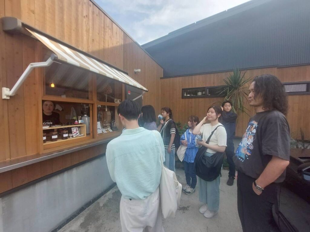 その後は、コーヒーかすの回収に協力していただける店舗の新規開拓を目的として、2手に分かれ、キノコノゴエン周辺および合宿の拠点である阿字ヶ浦にて4店舗を訪問しました。その結果、cafe umino様を含む2店舗からご承諾をいただくことができました。また、808 Cafe Bar様については、訪問時に学生から直接お願いすることはできませんでしたが、後日キノコノゴエンからの依頼により、回収にご協力いただけることになりました。自分たちの言葉で活動の目的を伝えることの難しさを感じると同時に、思いが相手に伝わった際の手応えも実感できた一日となりました。