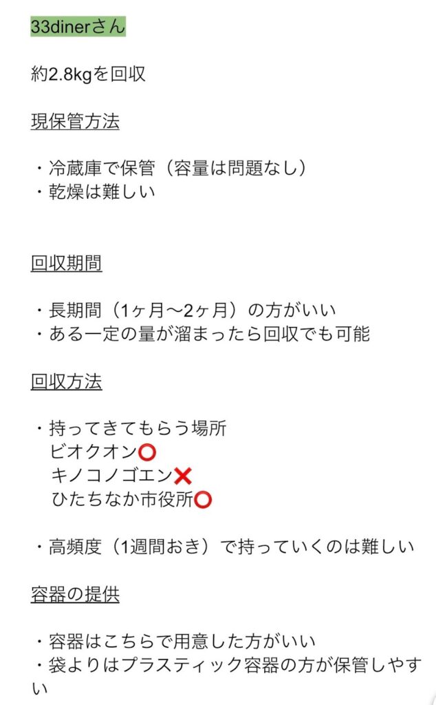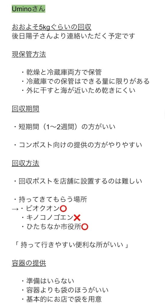 回収にあたり、DMやSMSによる事前連絡をおこないました。事前連絡では、私たちの活動の内容や意義、回収後の用途をお伝えしました。また、実際に店舗を訪問し回収をおこなう際にインタビューを実施しました。当初は、プロジェクト期間中に継続的な回収を行うことや、回収ポストの設置によって協力店舗にコーヒーかすを持参していただくことも検討していたため、保存方法や回収方法、回収頻度などについて、店舗ごとに望ましい形を伺いました。