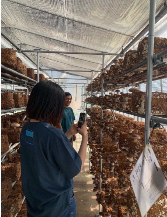 午後からは私たちの活動にご協力いただいているキノコノゴエンを見学し、菌床からきのこが生産されるまでの工程について学びました。菌床づくりから収穫に至るまでの一連の流れを、メンバー全員が初めて知る機会となり、温度や湿度の調整、雑菌対策など、細やかな管理の重要性を実感しました。