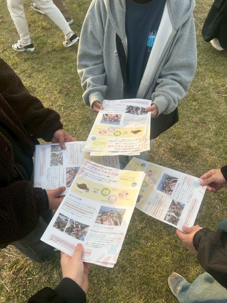 また、より詳細な情報へ円滑にアクセスできるようにInstagramアカウントのQRコードを掲載し、継続的な関心につなげる工夫を取り入れました。作成したチラシは、「ひたちなかコーヒーフェスティバル2025」や自主企画イベント「Coffee Loop Lab 〜コーヒーかすから、花が咲く日〜」にて来場者や地域住民の方々へ配布しました。配布時には口頭での説明を加えることで、直接コミュニケーションを取りながら理解を深めてもらうことができました。最終的に計133枚のチラシを一人一人に手渡しで配ることができ、アップサイクルへの認知向上に寄与できたと実感しています。