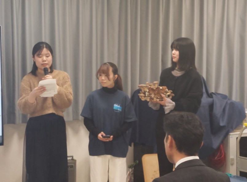 最終報告会でのプレゼンテーション終了後に、コーヒーきのこの試食会を行いました。合宿時に仕込んだコーヒーきのこが12月に収穫期を迎え、塩や醤油で味付けしたものを参加者の方々に試食していただきました。このコーヒーきのこは、プロジェクトの初期の段階では活動の中心に据えており開発まではできていたものの、商品化には至らなかったため、最終報告会にて試食として提供させていただきました。試食した方々から、「おいしい」「味が詰まっている」といった大変うれしい声をいただくことができました。この試食会を開催できたのは、BioQUON、キノコノゴエン、ひたちなか市の協力があってこそです。関係者の皆さまに深く感謝したいです。